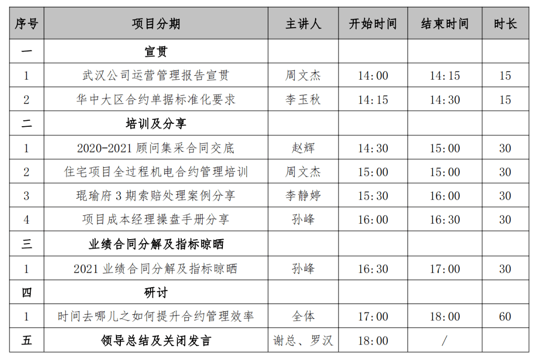 會(huì)議伊始,進(jìn)行了兩項(xiàng)宣貫和四項(xiàng)培訓(xùn)及經(jīng)驗(yàn)分享。兩項(xiàng)宣貫內(nèi)容分別為:武漢公司運(yùn)營管理報(bào)告和華中大區(qū)合約單據(jù)標(biāo)準(zhǔn)化要求,四項(xiàng)培訓(xùn)及經(jīng)驗(yàn)分享分別為:2020-2021年顧問集采合同交底、住宅項(xiàng)目全過程機(jī)電合約管理培訓(xùn)、琨瑜府 3 期索賠處理案例分享、項(xiàng)目成本經(jīng)理操盤手冊(cè)分享。