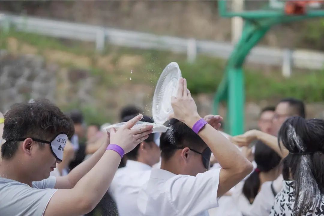 除了力量與才智,工作中更不可缺的是團(tuán)隊協(xié)作能力,接下來的這個游戲尤其考驗隊員的默契。每組隊員戴上眼罩向背后隊員傳遞面粉,藍(lán)隊通過完美的配合,以傳遞面粉量最多者獲得第一,積3分。