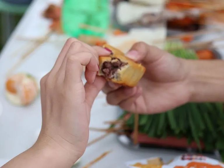 吃貨們被彌漫周圍的烤肉香引得口水直流,情誼也隨著縷縷炊煙逐漸升華。大家圍坐在一起,津津有味地品嘗著自己的勞動(dòng)成果,簡(jiǎn)直是人間美味!