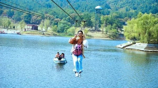 經(jīng)過大約兩個小時的車程,9點左右到達木蘭山景區(qū)。所有人分成4個小組,分別選出4個小組長帶隊游玩。木蘭草原內(nèi)游玩項目眾多,騎馬、射箭、草原駱駝、滑草、溜索、騎馬車等,這是每位來到木蘭草原的游客必玩的項目。另外還有游船、竹筏、水上自行車、太空球、碰碰船、山地車、海盜船、小蜜蜂、旋轉(zhuǎn)木馬、水上浮橋,水上游樂項目是最受年輕人的喜愛,在這里可以體驗到別樣的樂趣,既刺激,又充滿挑戰(zhàn)。大家都玩得不亦樂乎。