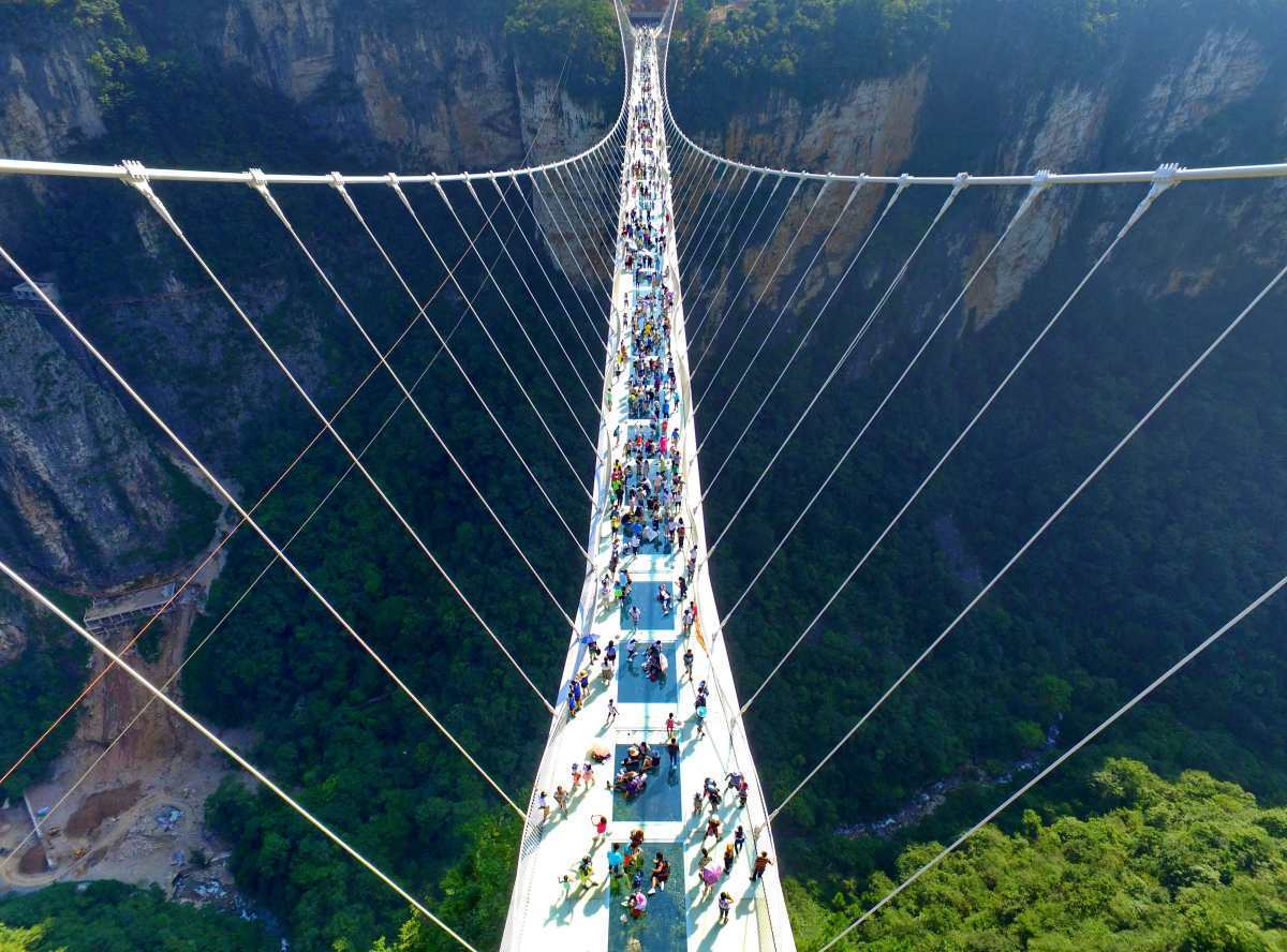 張家界大峽谷玻璃橋位于湖南省的張家界大峽谷景區(qū)內(nèi),號稱世界最長、最高的全透明玻璃橋,玻璃橋總長430米、寬6米,橋面距谷底約300米,可站800人。橋面全部采用透明玻璃鋪設(shè),橋中心有全球最高的蹦極臺,整個工程無鋼筋支架,是一種全玻璃結(jié)構(gòu)的橋梁。